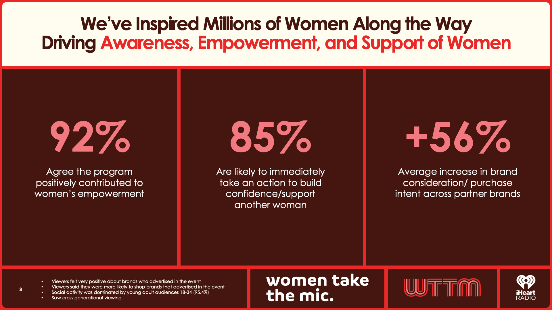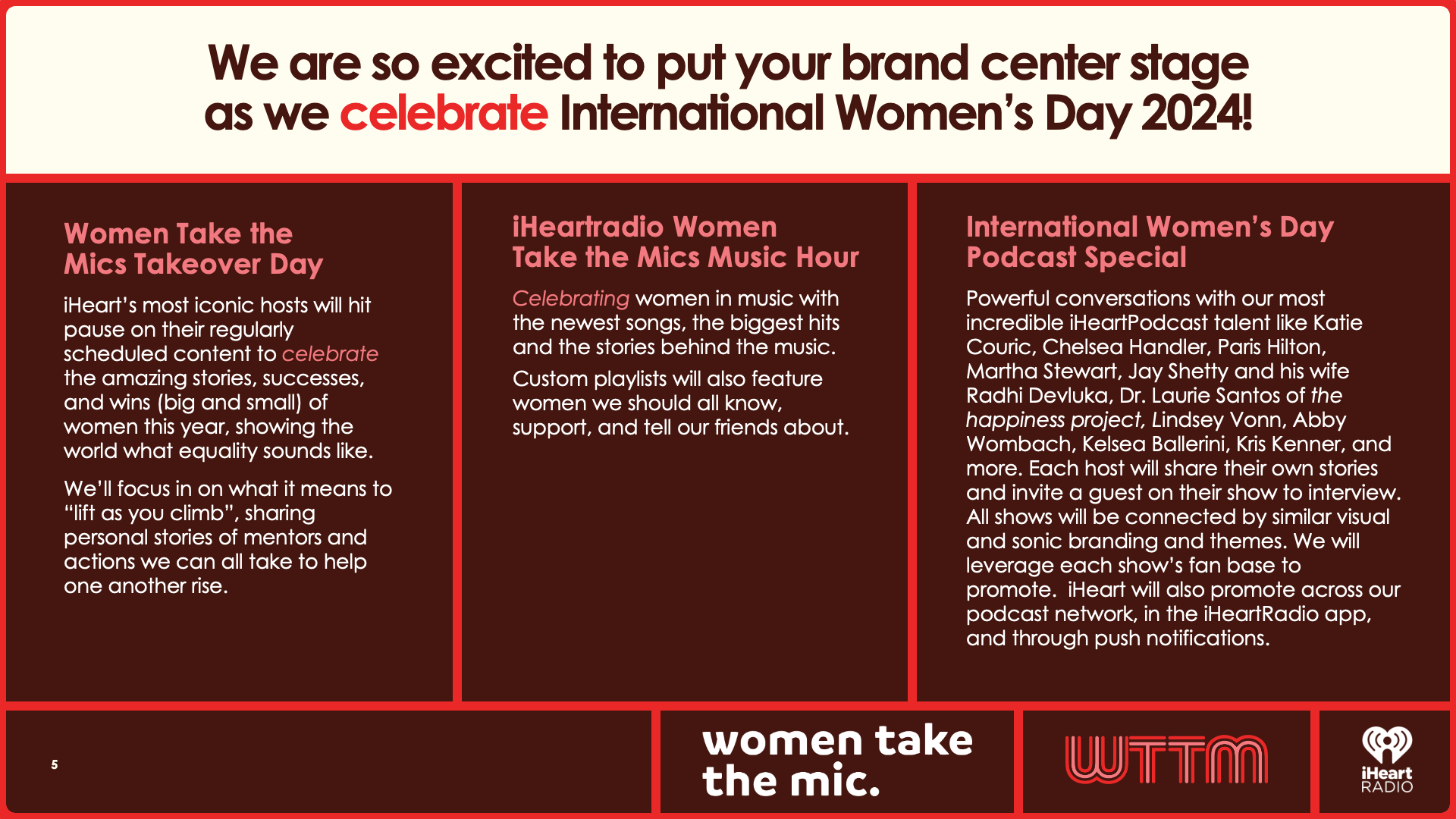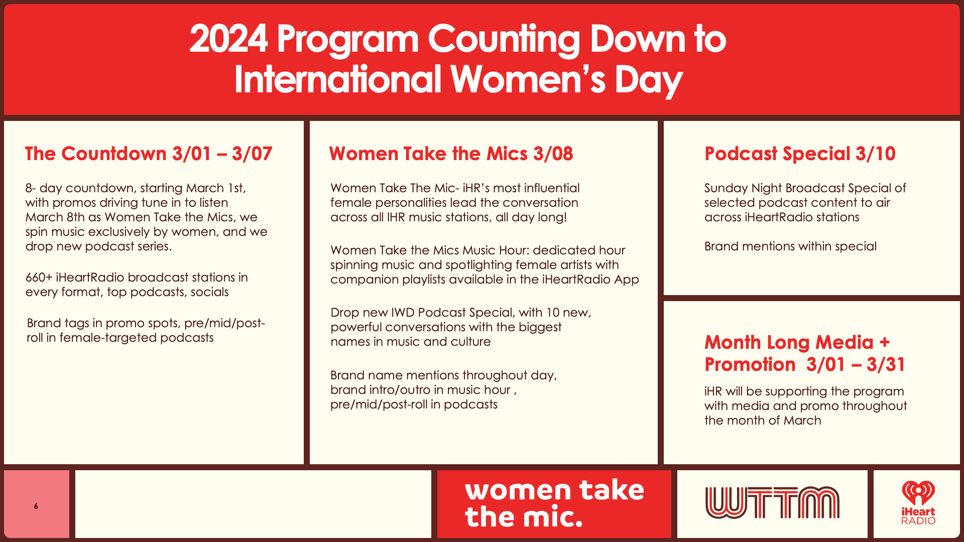 Event Summary: "Women Take the Mic" is iHeartMedia’s celebration of women in music, media, and culture. Featuring takeovers, curated content, and voices that inspire.